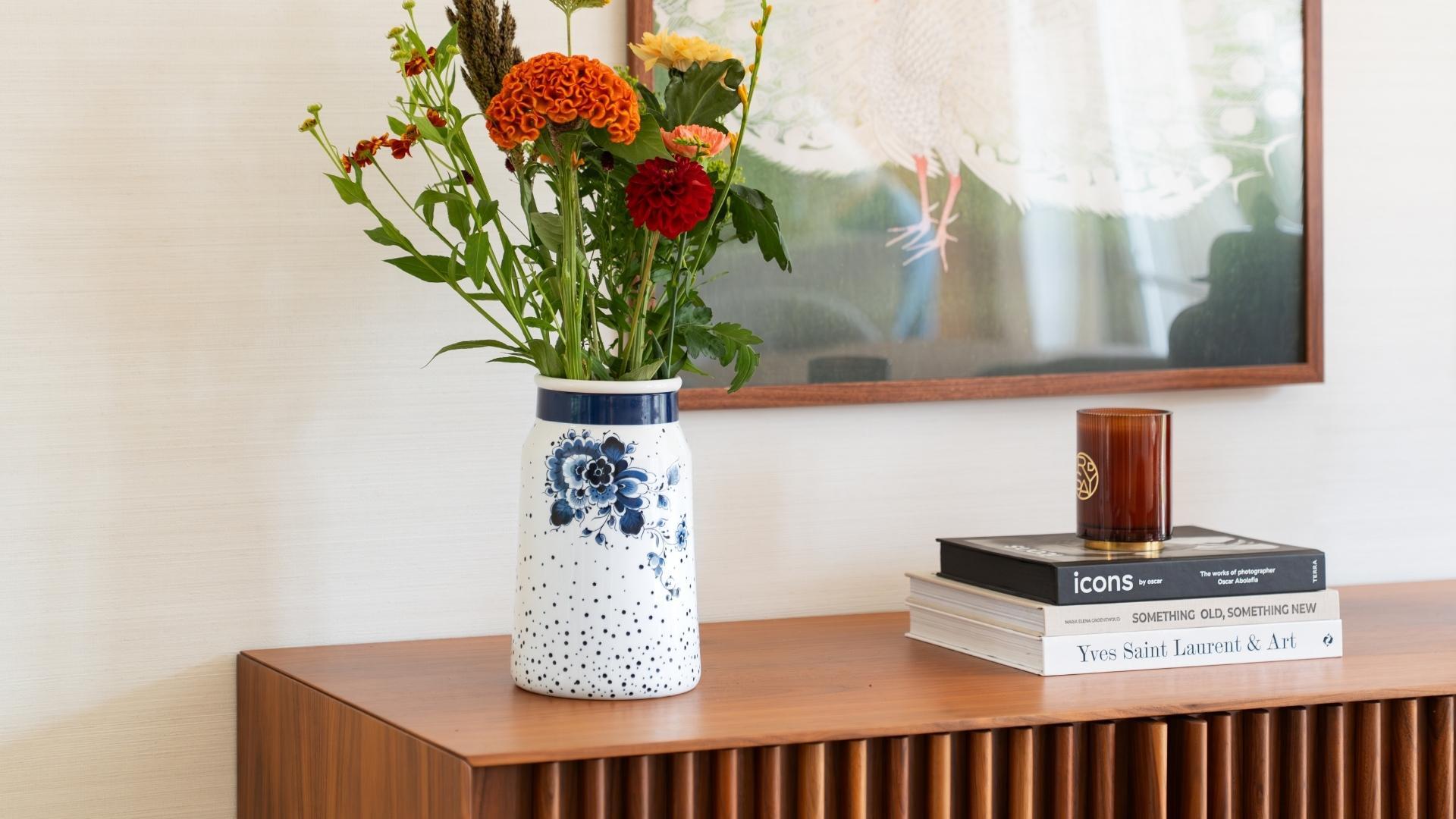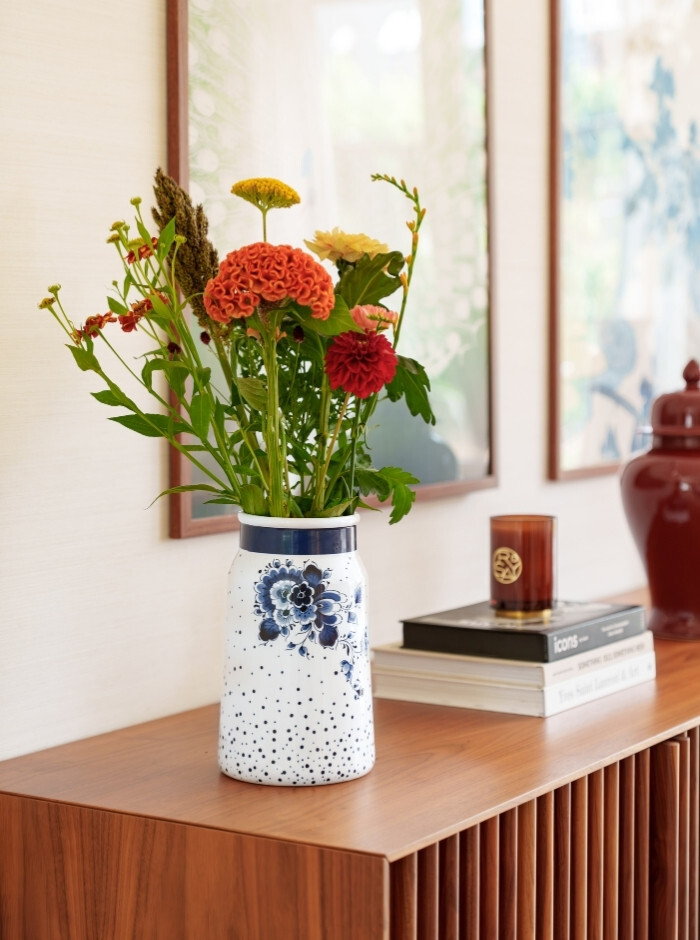 Ontdek de nieuwe Blauwe Stip producten: Melkbusvazen en mokken met een frisse en speelse knipoog naar het klassieke Delfts blauw. De patronen met bloemen en stippen brengen een luchtige, moderne twist in jouw interieur. De Blauwe Stip collectie is perfect te combineren met onze wandborden of andere melkbusvazen. Ontdek nu!