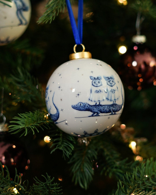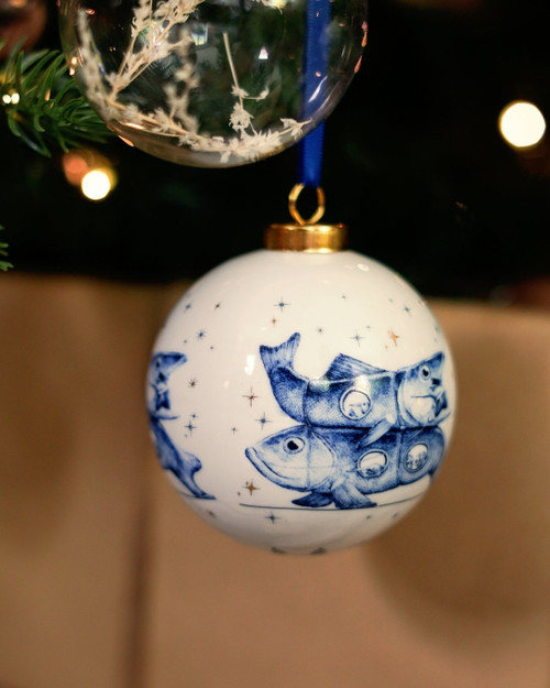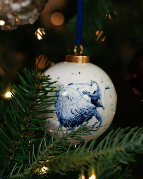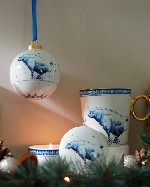 Een Delfts blauwe kerstbal met het sterrenbeeld weegschaal erop. Deze kerstbal met sterrenbeeld is ontworpen door beeldend kunstenaar Redmer Hoekstra. Je herkent zijn illustraties meteen aan hun humoristische en dagdromerige illustraties. Een bonte optocht van surrealistische figuren uit de dierenriem, die de wereld van Heinen Delfts Blauw komen binnenmarcheren, kruipen of rollen. Bekende vazen en serviesstukken zijn de ongewone vervoersmiddelen van deze astrologische dieren. Deze bijzondere collectie Zodiak kerstballen voert je mee naar een nieuwe wereld vol humor. Op deze kerstbal heeft Redmer Hoekstra zijn eigen interpretatie van het sterrenbeeld weegschaal gemaakt. Iedereen weet dat kikkers flinke lastposten kunnen zijn, maar als een echte diplomaat weet deze vogel de twee in harmonie en balans te houden. Laat de twee glibberige praatjesmakers maar verhitte discussies voeren onder het genot van een kopje koffie, de vogel zorgt er wel voor dat het beschaafd en vriendelijk blijft. Een bijzonder leuk cadeau voor iemand anders, of voor jezelf zodat je altijd je eigen spirit animal dichtbij je hebt.
