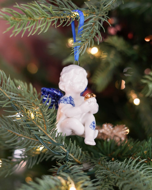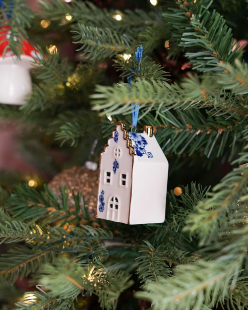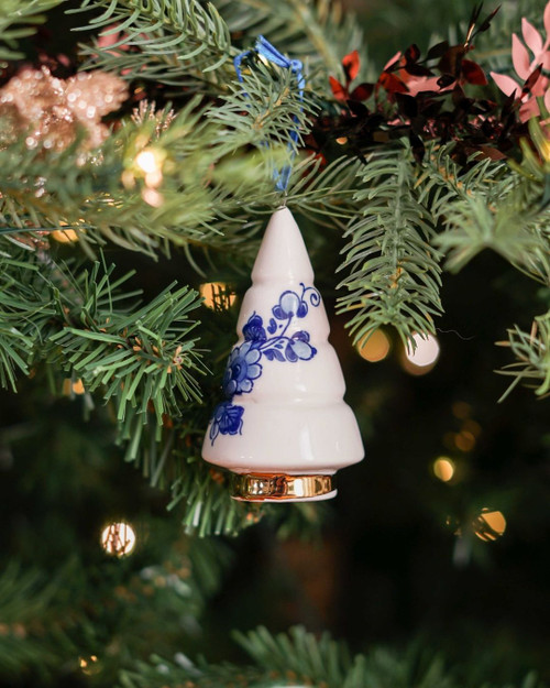 Een kerstornament voor in de kerstboom in de vorm van een speelse kat. De kersthanger is gemaakt van keramiek en de zijkanten zijn gedecoreerd met kleine Delfts blauwe bloemen, terwijl de uitdagende staart goudkleurig is. Meer informatie