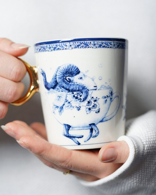 Een Delfts blauwe mok met het sterrenbeeld maagd erop.