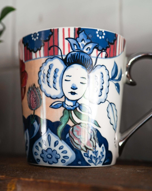 Een kleurrijke theemok met oud-Hollandse kleuren en patronen gemaakt van keramiek. De theemok is een ontwerp van kunstenaar Pepijn van den Nieuwendijk voor Heinen Delfts Blauw en is gebaseerd op de bijzondere klederdracht van de vele streken in Nederland. Wat meteen in het oog springt is de kanten Isabee, de klederdracht muts. Smetteloos wit, haarscherp gevouwen en een enorme flap die kaarsrecht overeind blijft staan als een soort heldere halo. Het maken en opzetten van zo’n Isabee was een kunst waar uren precisie werk in zit. Wit als porselein moest deze mooie kleur van het pure kant wel behouden blijven. Werd de muts te koud gestreken dan kreeg hij lelijke vlekken, werd hij te heet gestreken dan verbrandde het stijfsel. Om ook ons porselein prachtig wit te krijgen, moesten vader Jaap en zoon Jorrit Heinen door middel van uitproberen de juiste receptuur voor hun klei vinden en vervolgens uitzoeken op exact welke temperatuur hun Delfts blauw gebakken moest worden. Dankzij jarenlange ervaring kennen ze het ambacht als geen ander en maken alles naar eigen recept.